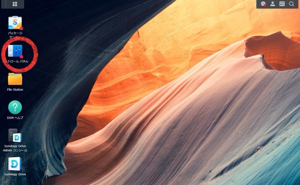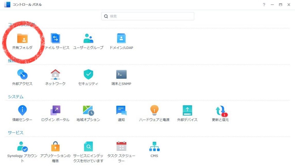 サーバー画面の「コントロールパネル」を開き、「共有フォルダ」を開きます。