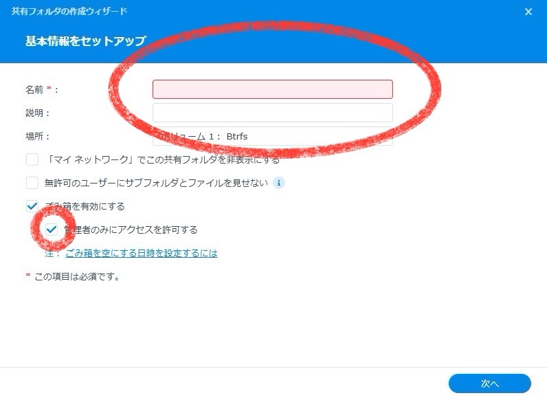 その他のチェックボックスを触る必要はありませんが、ゴミ箱を有効にする場合、下の「管理者のみにアクセスを許可する」のチェックは外します。